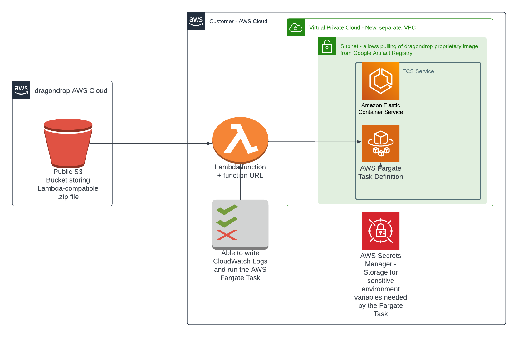 1\) Define a ECS Fargate task that hosts the proprietary dragondrop container.