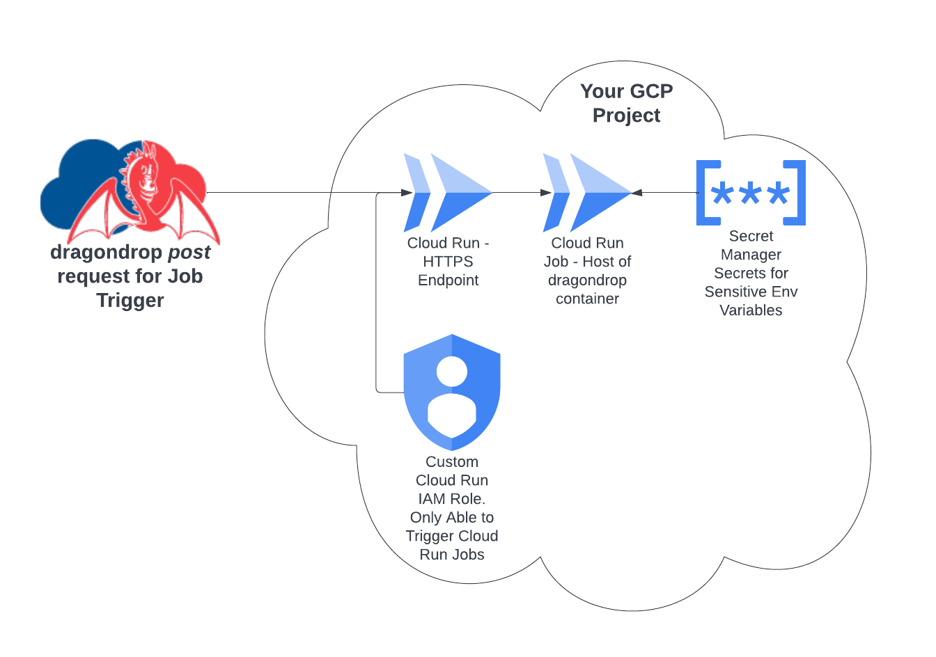 <figure><img src="https://646963993-files.gitbook.io/~/files/v0/b/gitbook-x-prod.appspot.com/o/spaces%2FW6raDc19KWpYtiXJIvGE%2Fuploads%2FwdEVrTTqdOrRgI19csph%2F2023-01-18%20GCP%20Module%20Infrastructure.png?alt=media&#x26;token=0d3d2dfd-7368-4bbf-9f9b-ae2e591b41a0" alt=""><figcaption><p>Our Terraform module for GCP infrastructure will get you spun up with a secure, serverless hosting of dragondrop in minutes. </p></figcaption></figure>