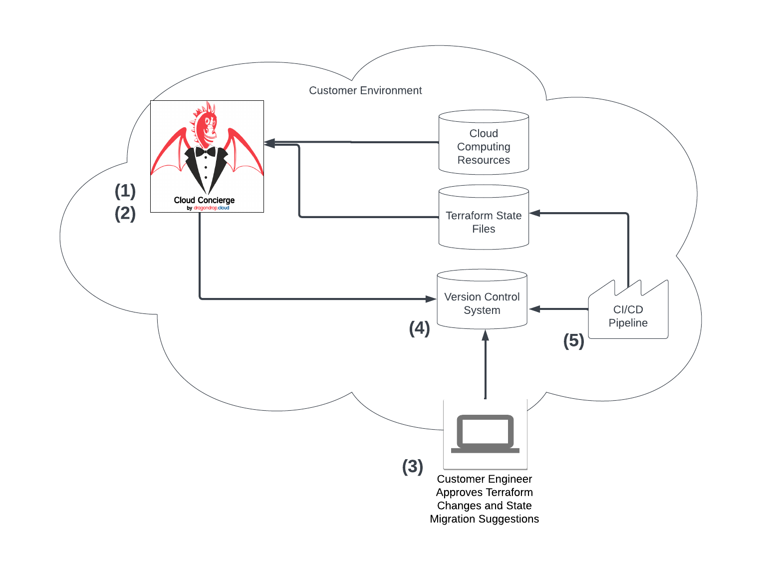 1\) cloud-concierge hosted in your cloud clones a Version Control repository of your choice, creates a representation of your designated cloud environment subset in Terraform, and pulls down the current state of Terraform by downloading remote state files. All data is stored ephemerally in a volume attached to the cloud-concierge container instance.